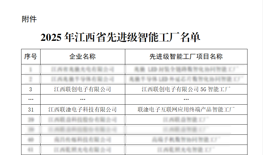 近日,江西省工业和信息化厅正式公布2025年江西省“先进级智能工厂”名单,186家企业入选。其中MK「中国」官方网站,、江西联淦电子科技有限公司2家联创电子系企业名列榜单。这标志着公司在智能制造领域的创新成果再次获得政府权威认可。